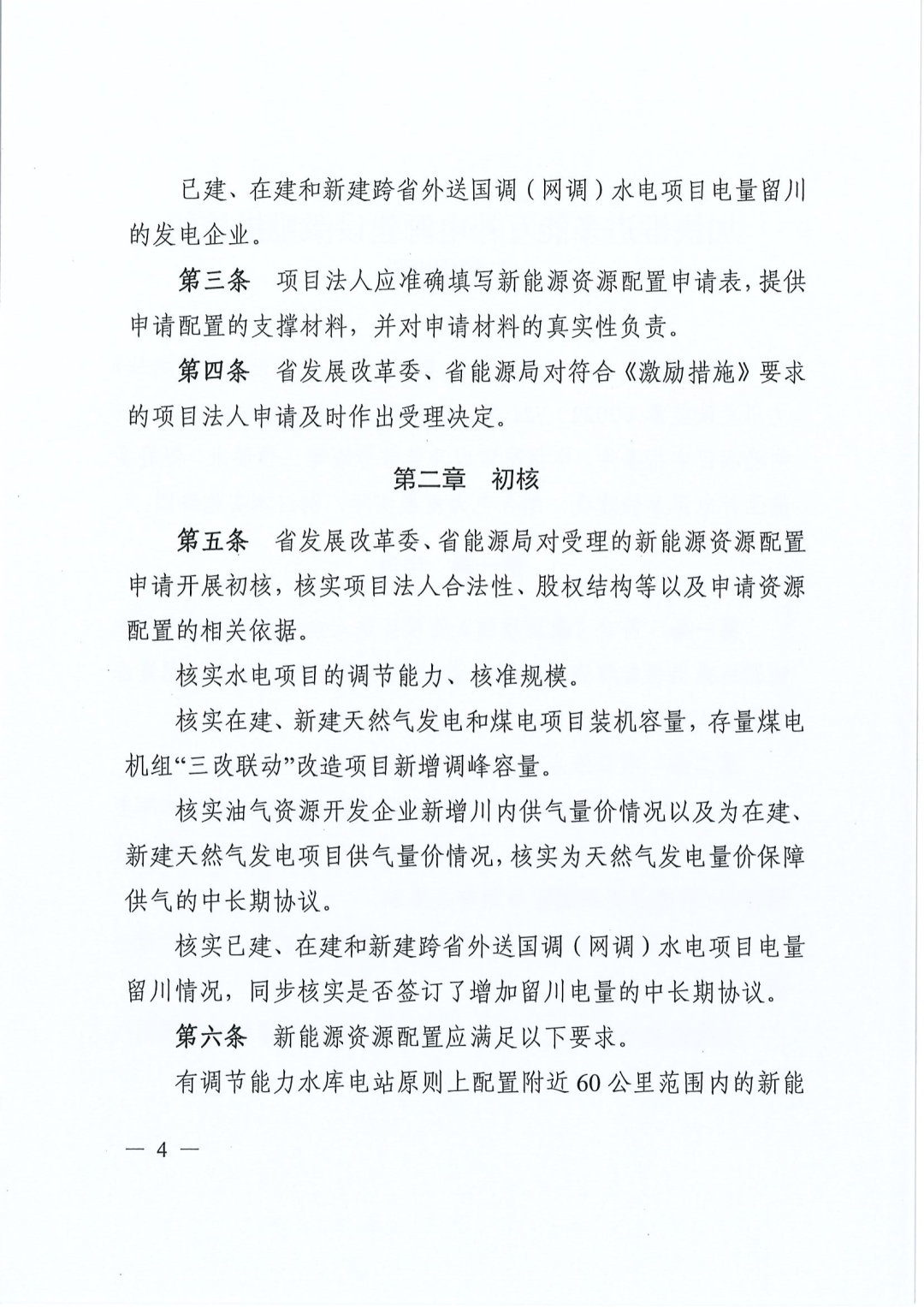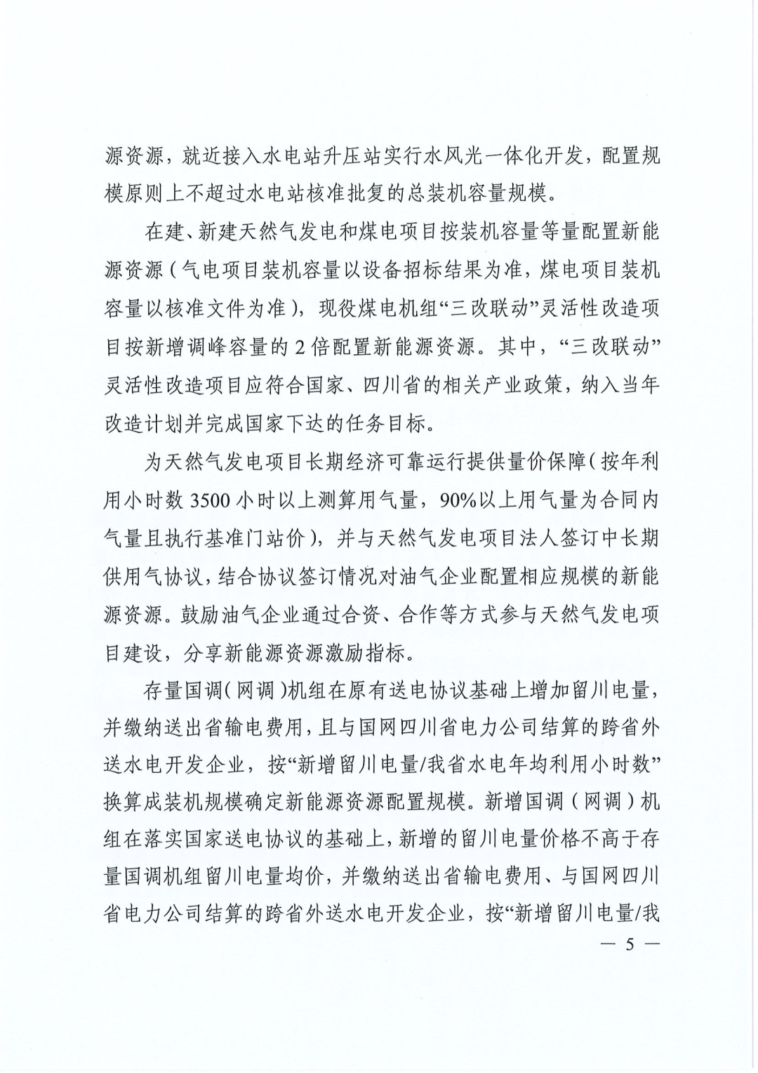 存量國(guó)調(diào)(網(wǎng)調(diào))機(jī)組在原有送電協(xié)議基礎(chǔ)上增加留川電量,并繳納送出省輸電費(fèi)用,且與國(guó)網(wǎng)四川省電力公司結(jié)算的跨省外送水電開(kāi)發(fā)企業(yè),按“新增留川電量/我省水電年均利用小時(shí)數(shù)”換算成裝機(jī)規(guī)模確定新能源資源配置規(guī)模。新增國(guó)調(diào)(網(wǎng)調(diào))機(jī)組在落實(shí)國(guó)家送電協(xié)議的基礎(chǔ)上,新增的留川電量?jī)r(jià)格不高于存量國(guó)調(diào)機(jī)組留川電量均價(jià),并繳納送出省輸電費(fèi)用、與國(guó)網(wǎng)四川省電力公司結(jié)算的跨省外送水電開(kāi)發(fā)企業(yè),按“新增留川電量/四川省水電年均利用小時(shí)數(shù)”換算成裝機(jī)規(guī)模確定新能源資源配置規(guī)模,鼓勵(lì)進(jìn)一步降低留川電量?jī)r(jià)格。